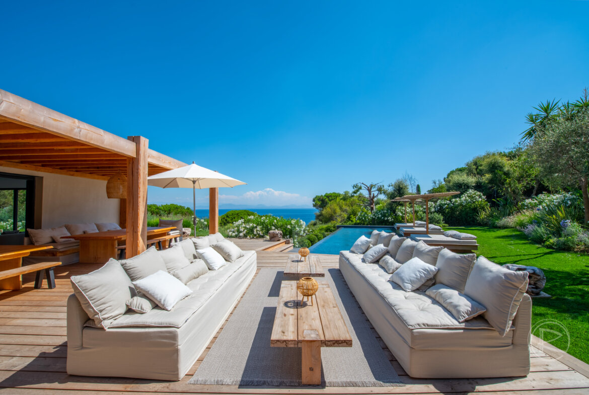 Enjoying sublime sweeping sea views reaching to the peaks of the Alps in an outstanding setting in the prestigious private domain of Les Parcs de Saint-Tropez, Villa Polynesia was designed by a renowned Saint-Tropez architect with a superb aesthetic and the highest quality materials.